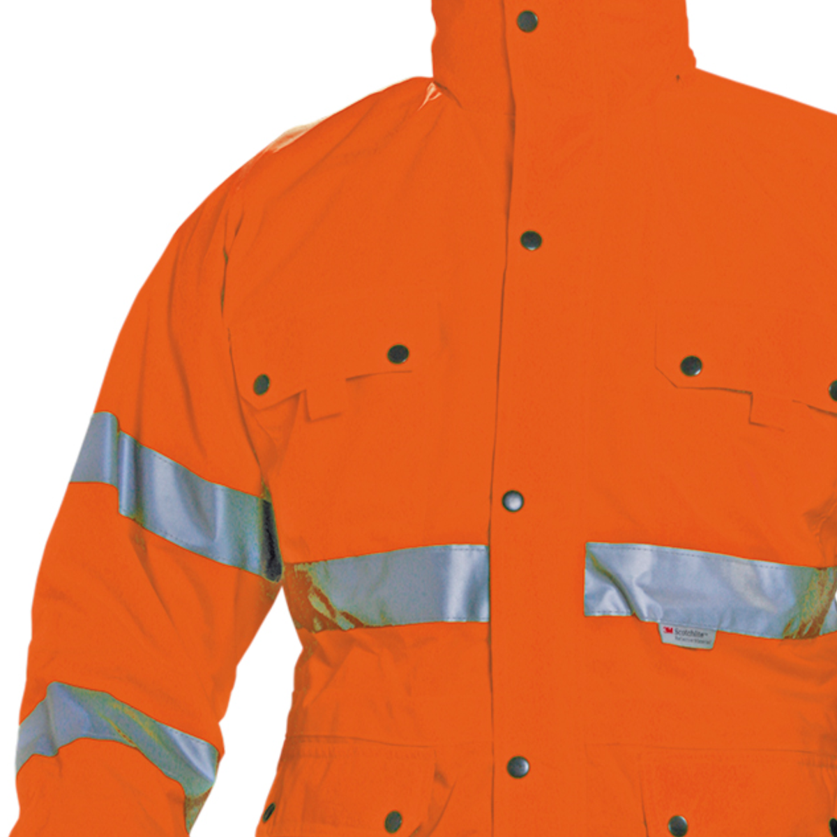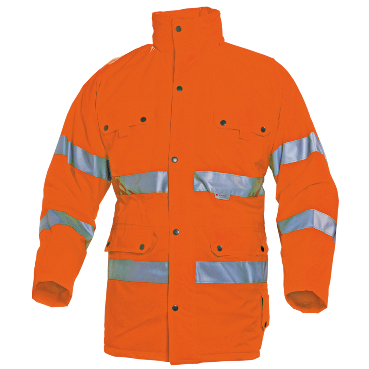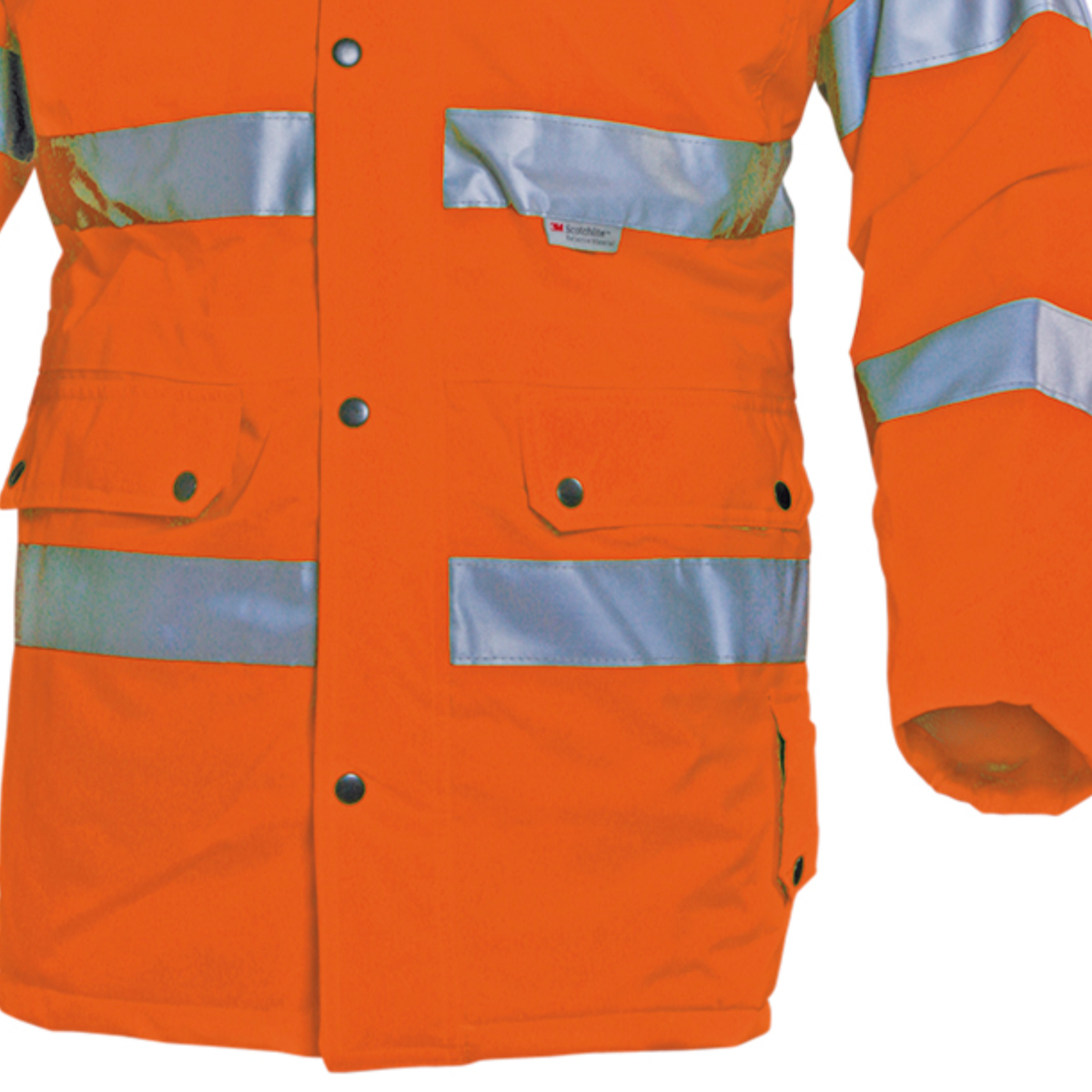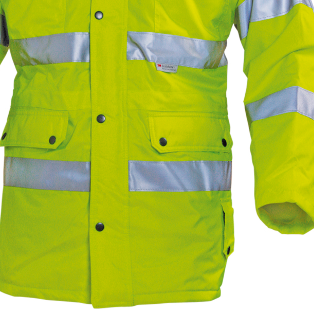 Parka haute visibilité adaptée à une utilisation dans des conditions de visibilité réduite et/ou à risque pour l'utilisateur. Fermeture zippée centrale en nylon avec double protection contre l'eau et patte de boutonnage. Les coutures sont scellées, pour une meilleure protection contre les déchirures. Il a cinq poches, deux cachées avec un rabat en bas, deux poches plaquées avec un rabat en haut et une intérieure avec une fermeture éclair. Avec capuche amovible, il reste dans le col. Il intègre également un cordon de serrage interne à la taille pour une plus grande adaptabilité et une double bande réfléchissante périmétrique sur le corps et les manches.